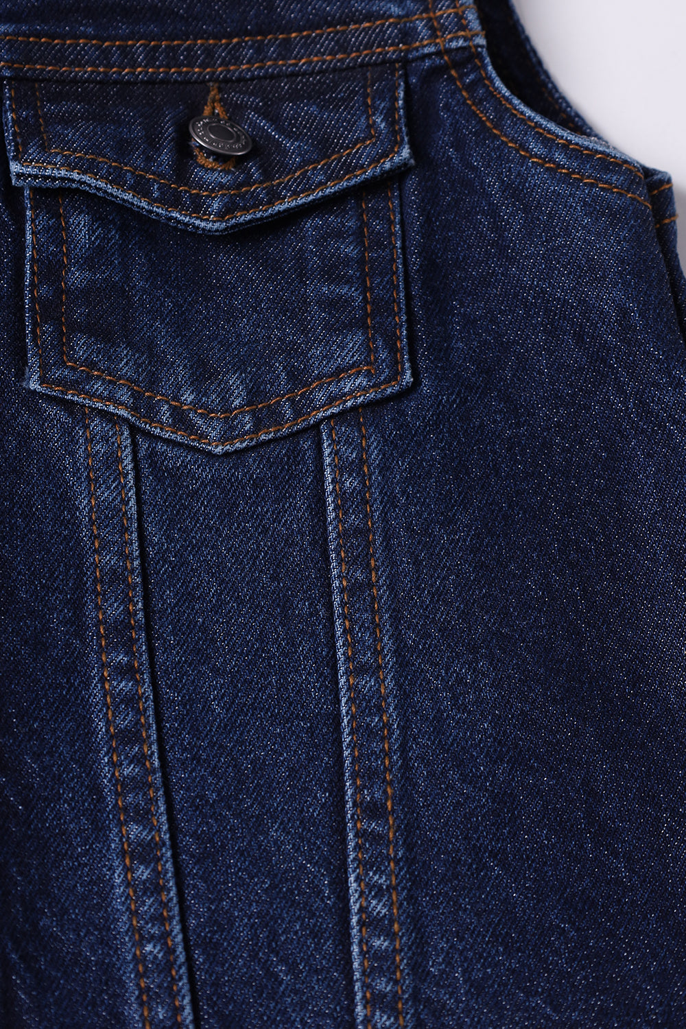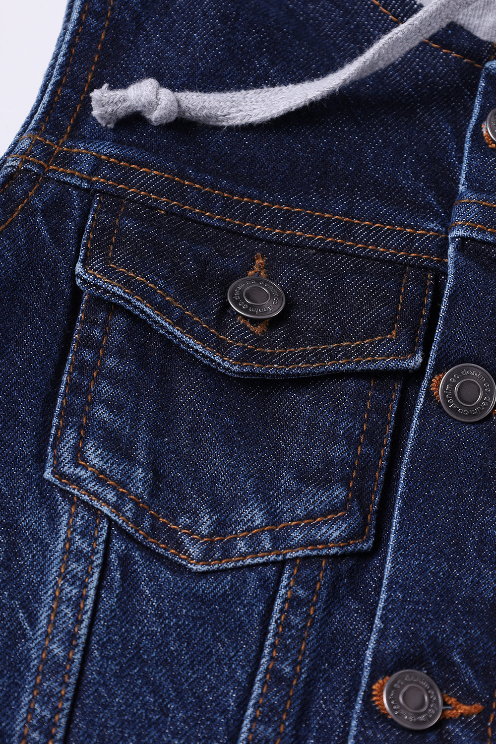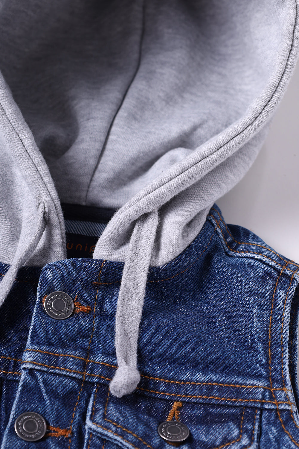 Stay warm and stylish with our BOY'S DENIM JACKET. This sleeveless jacket features a cozy fleece hood for added comfort. Embrace the versatility of denim with a modern twist. Perfect for any weather, this jacket will elevate your little one's look.