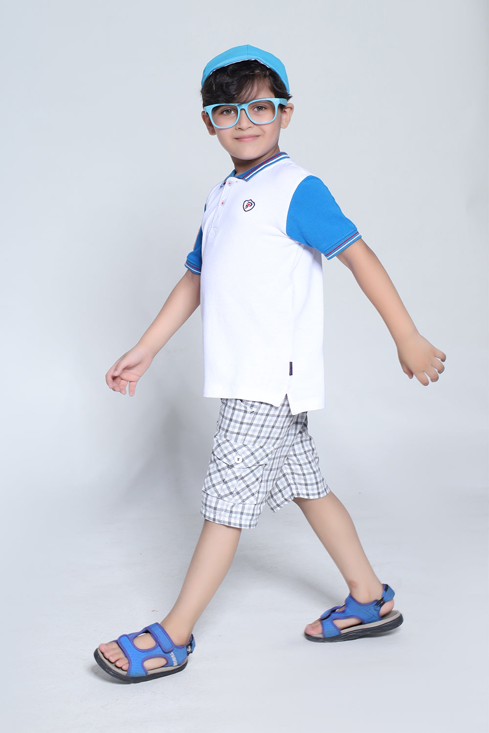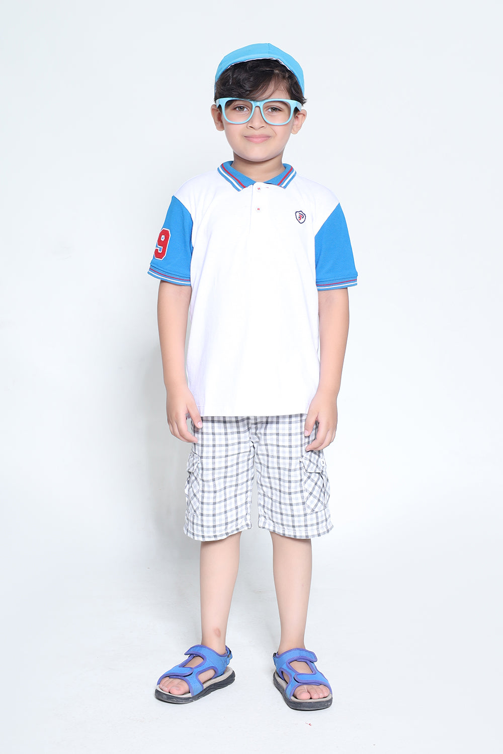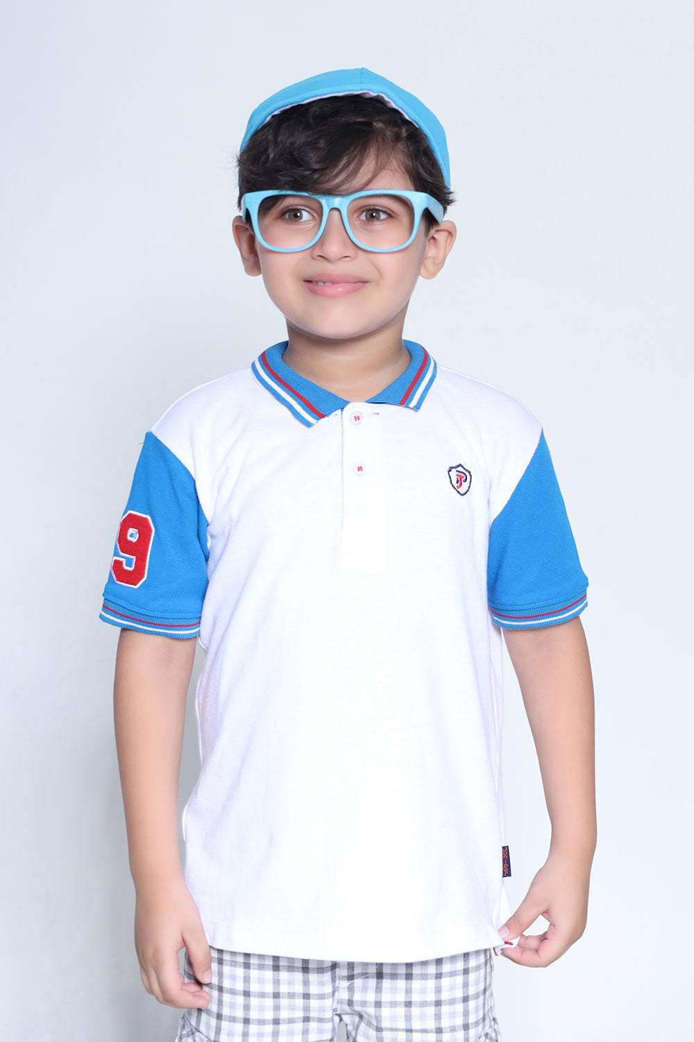 Upgrade your little one's wardrobe with our Boy's Polo Shirt. The white color provides a timeless and versatile look, while the blue sleeves add a touch of style. Made for comfort and durability, our polo shirt is perfect for any occasion. Available in multiple sizes.