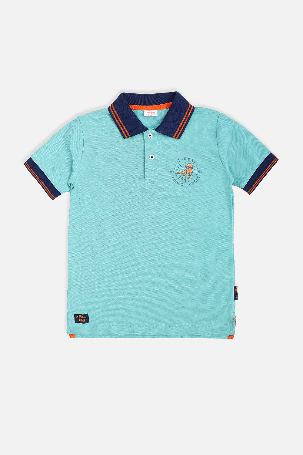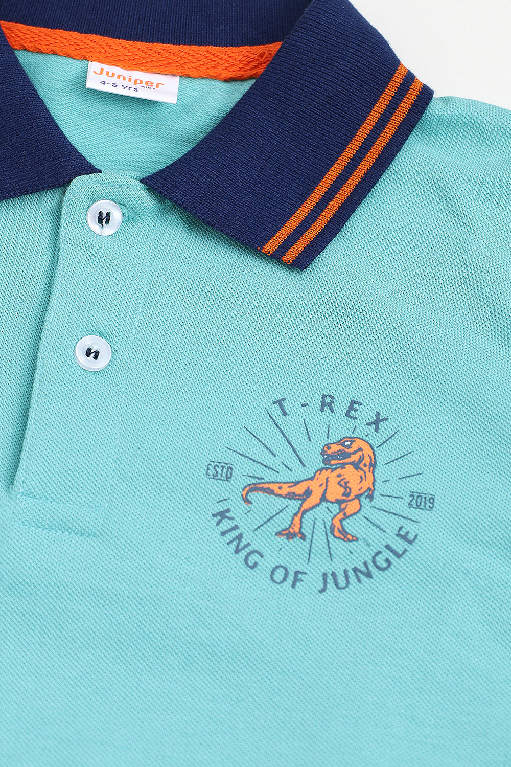 This boy's polo shirt features a stylish t-rex printed logo. Made with high-quality materials, it offers comfort and durability for everyday wear. Perfect for any young dinosaur lover, this shirt adds a touch of fun to any outfit. Dress to impress with this trendy and playful design.