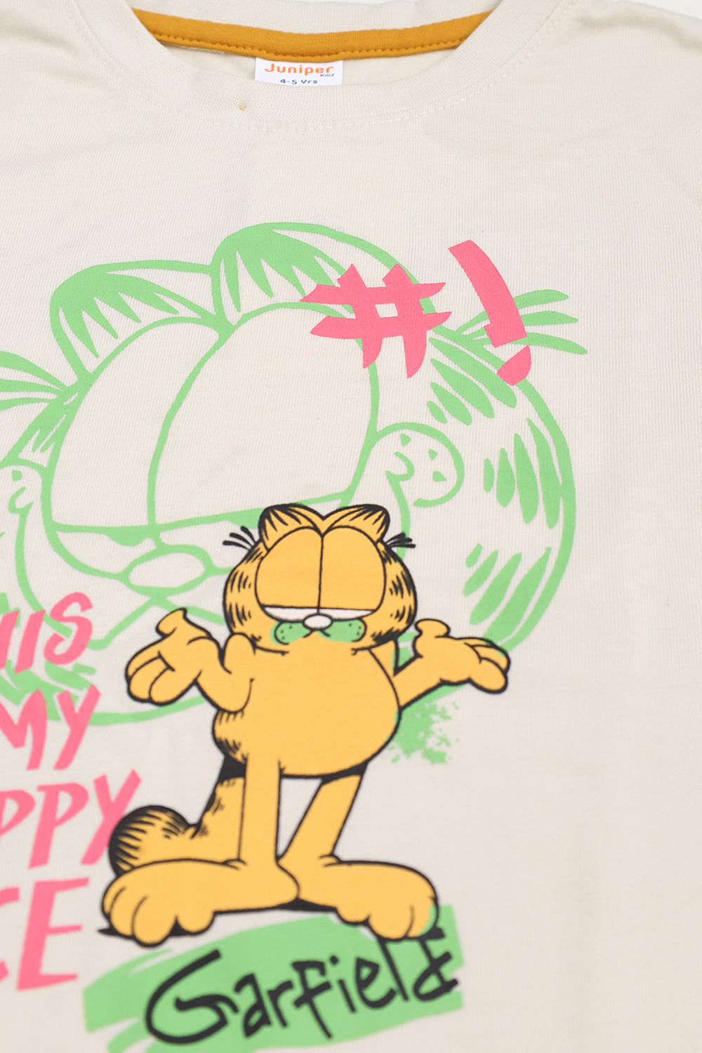This boy's t-shirt features a fun and playful Garfield happy face print. Crafted with short sleeves, it is perfect for any casual occasion. Add a touch of humor and style to your kid's wardrobe with this printed t-shirt.
